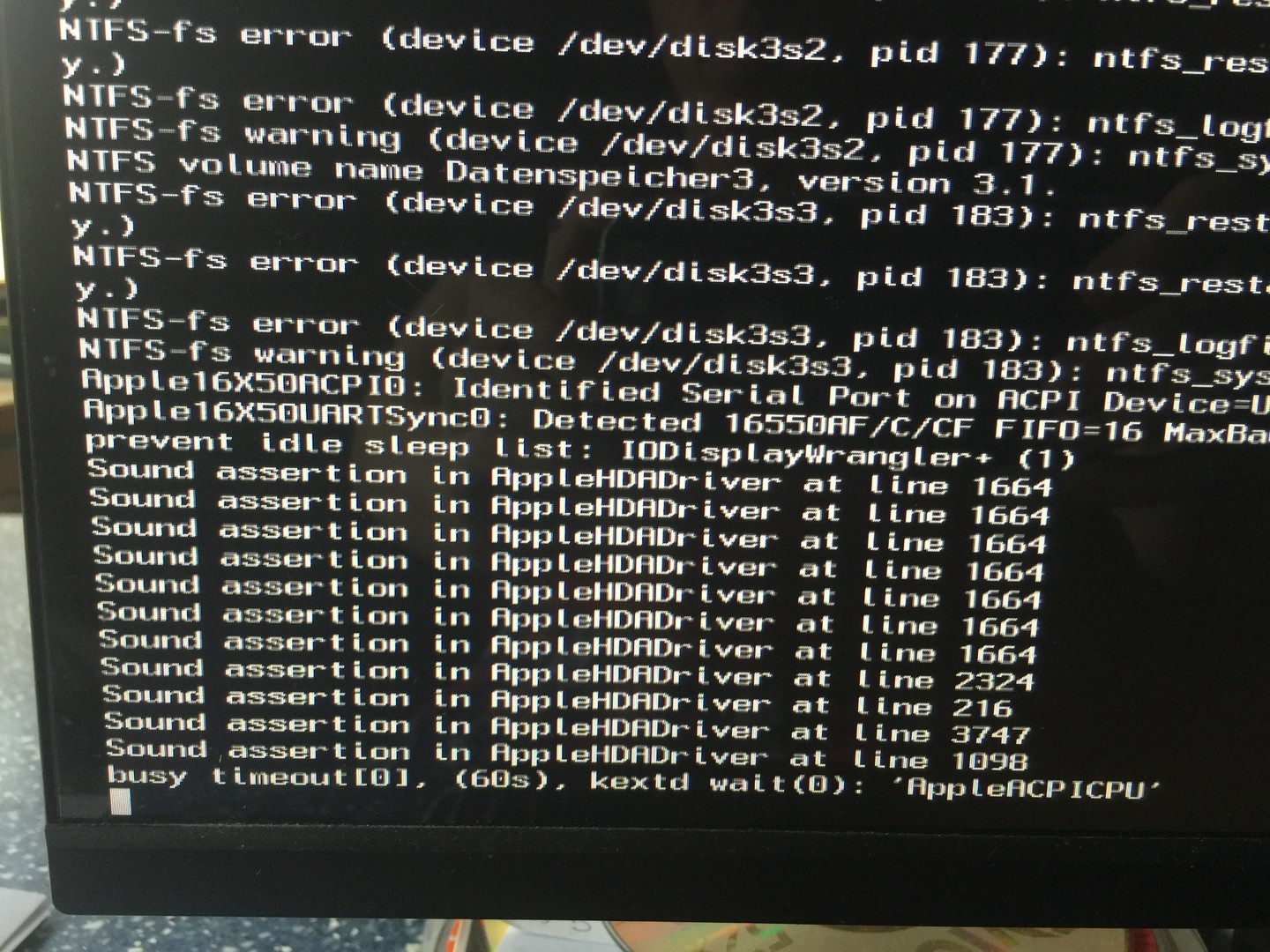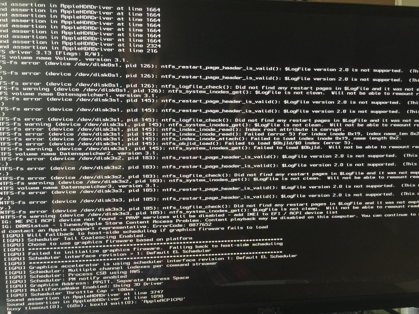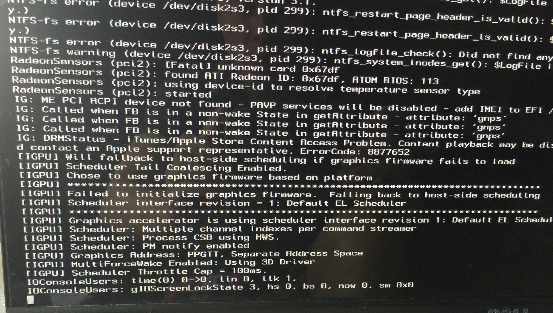 IOConsoleUsers:gi0ScreenLockState3,hs0,bs0,now0,sm0x0Also irgendwas mit der IGPU, kann er nicht laden