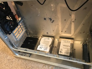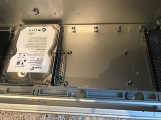 Gehäuse steht hier gerade auf dem Kopf, baue die Festplatten mit selbstgebauten Haltern ein
