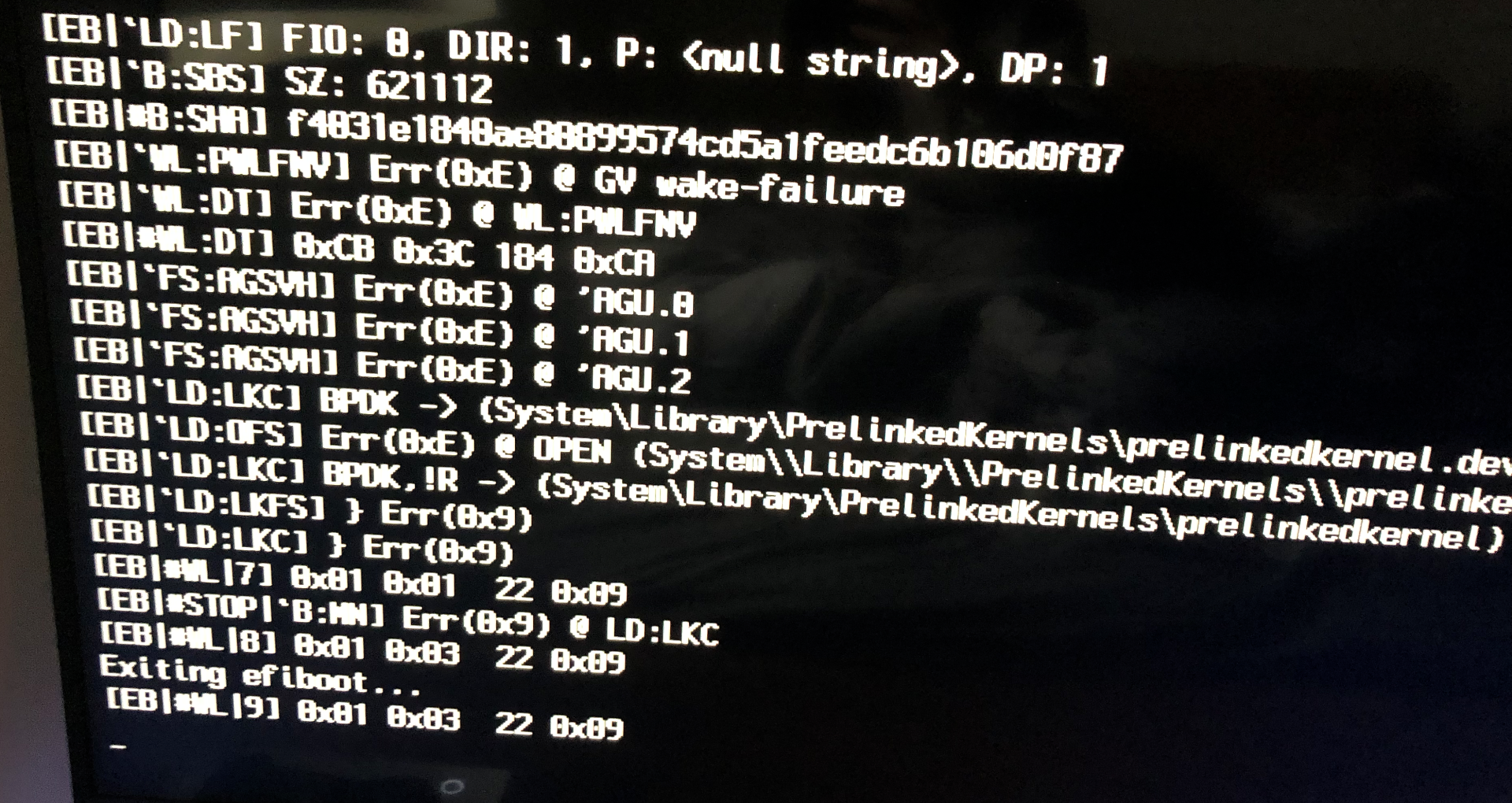 [EB|`LD:OFS] Err(0xE) @ OPEN (System\\Library\\PrelinkedKernels\\prelinkedkernel.development)