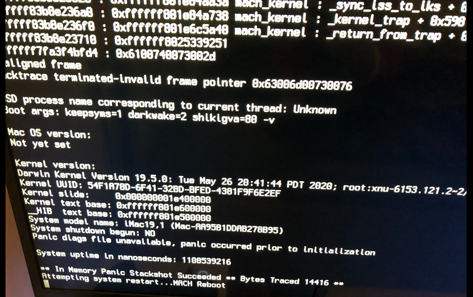 Bekomme eine ähnliche Meldung bei jedem Start (und dachte bisher das wäre einfach Debug Output, da ich sowieso mit "-v" boote). Jetzt ist es so, dass ungefähr jeder 2. Start fehlschlägt. Nach einem Nvram Reset funktioniert es.