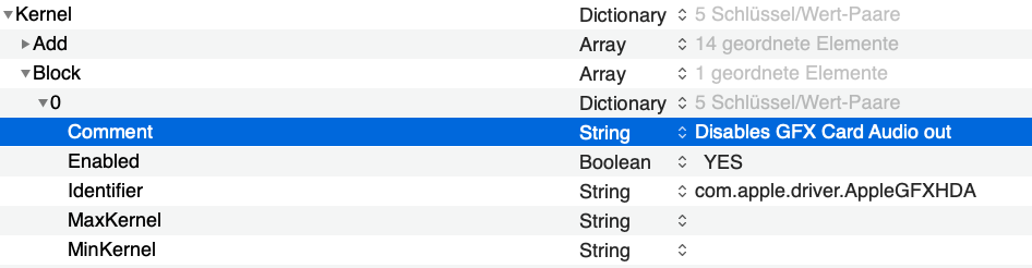 über OpenCore Configurator -> Kernel -> Block funktioniert leider auch nix, habe dort mal den AppleGFXHDA eingetragen.