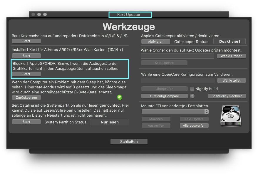 kann es sein das bei dem Tool Kext-Updater unter der Rubrik Werkzeuge das Blocken der HDMI Audio nicht mehr funktioniert ? Oder mache ich was Falsch?