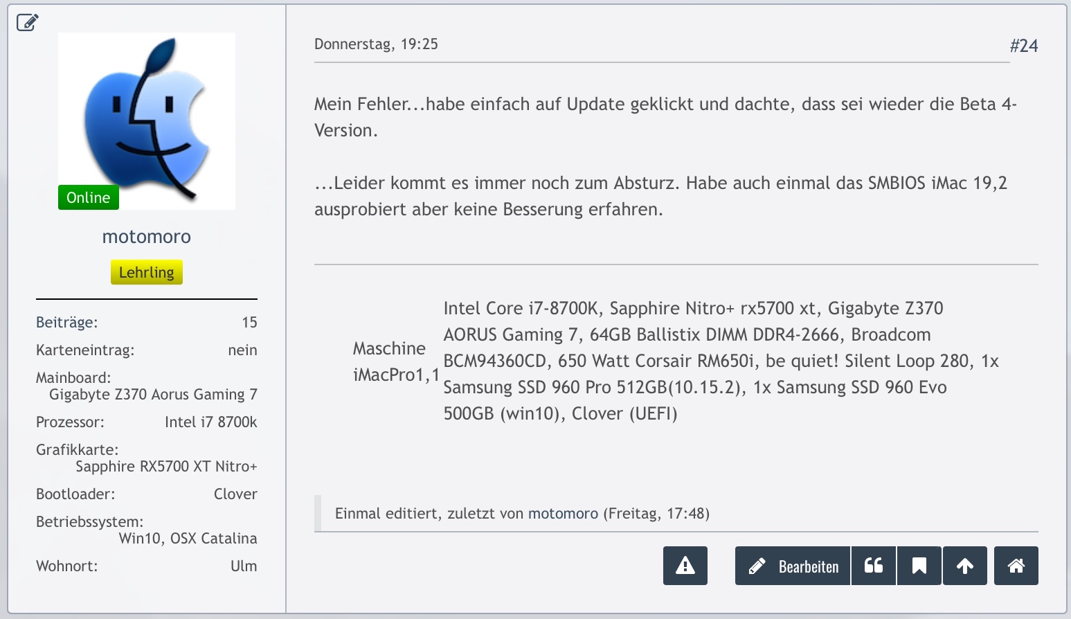 Vor der USB-Aktion (Patches/Hackintool/etc.) hatte ich übrigens einen erneuten Absturz...dieses mal aber während des Ruhemodus.