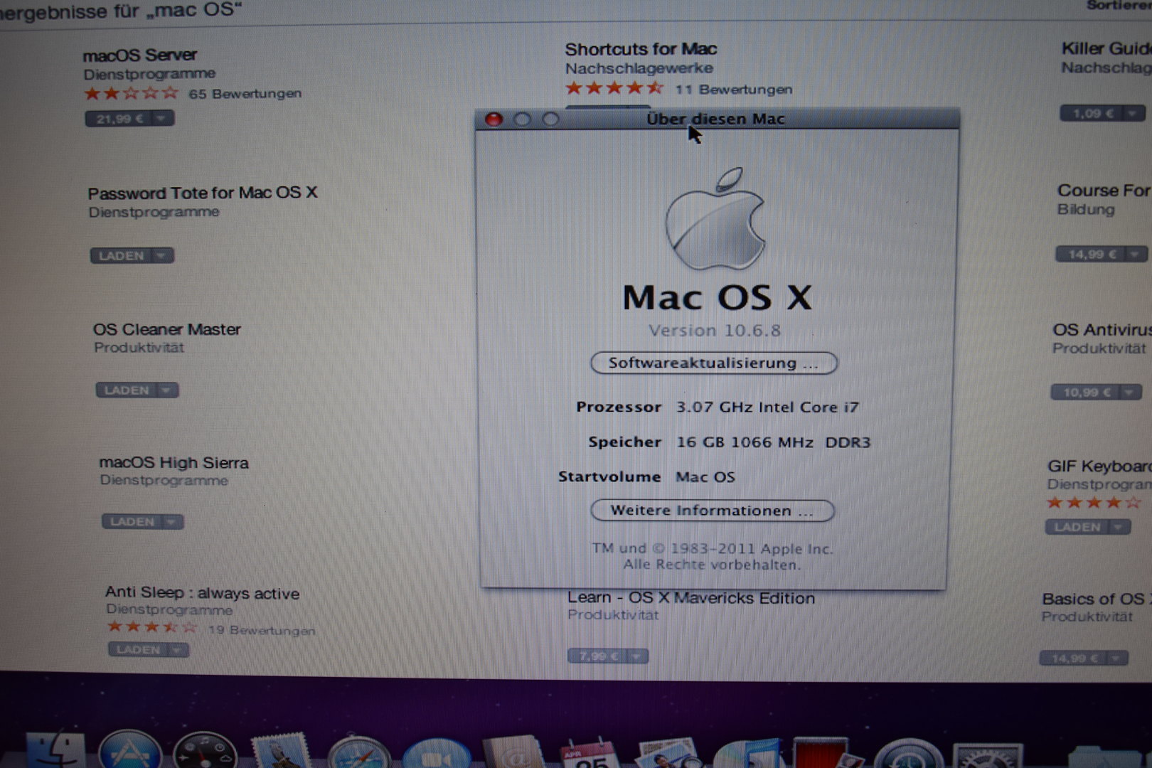 Also das System 10.6.8 Zeigte mir im App Store nur die High Sierra an konnte es aber nicht laden da der Store verbuggt war und jezt hat er Systemupdates gemacht sicherheitsupdates und itunes.... und jezt hängt er nach dem erzwungenem neustart im Bootscreen fest. Ich werde die Installation nochmals Starten und dann Screenshots machen von den Fehlern