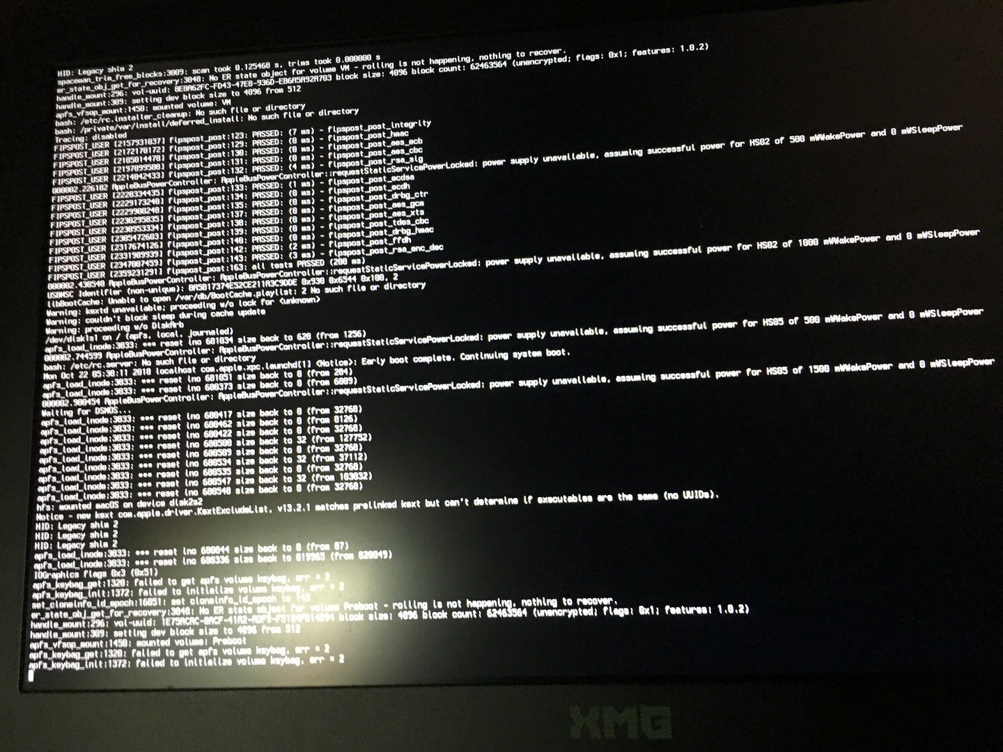 ich habe ein Problem mit meinen Hackbook. Denn ich habe Mojave installieren können (ohne Safemode) und jetzt startet der Hackbook nur mit Safemode oder in seltenen Fällen auch ohne. Es gibt 3 Fälle. Fall 1: Der Hackbook startet, Fall 2: Es hängt sich bei "IOConsoleUsers" auf, Fall 3: Es läuft bis Fall 2 und dann kommt ein Black Screen (No Signal, kein Schwarzes Bild, Laptopbildschirm ist aus). Vorher hing es bei "Wating For DSMOS" seit gestern geht es magischerweise bis "IOConsoleUsers". Manchmal hängt es sich auch mitten in der Zeile auf (z.B. wird ein Wort im Verbose Mode nur halb auf dem Bildschirm angezeigt). Habe es schon mit paar Bootflags Probiert, hat alles nichts gebracht. Ich bin für alle Antworten Dankbar.