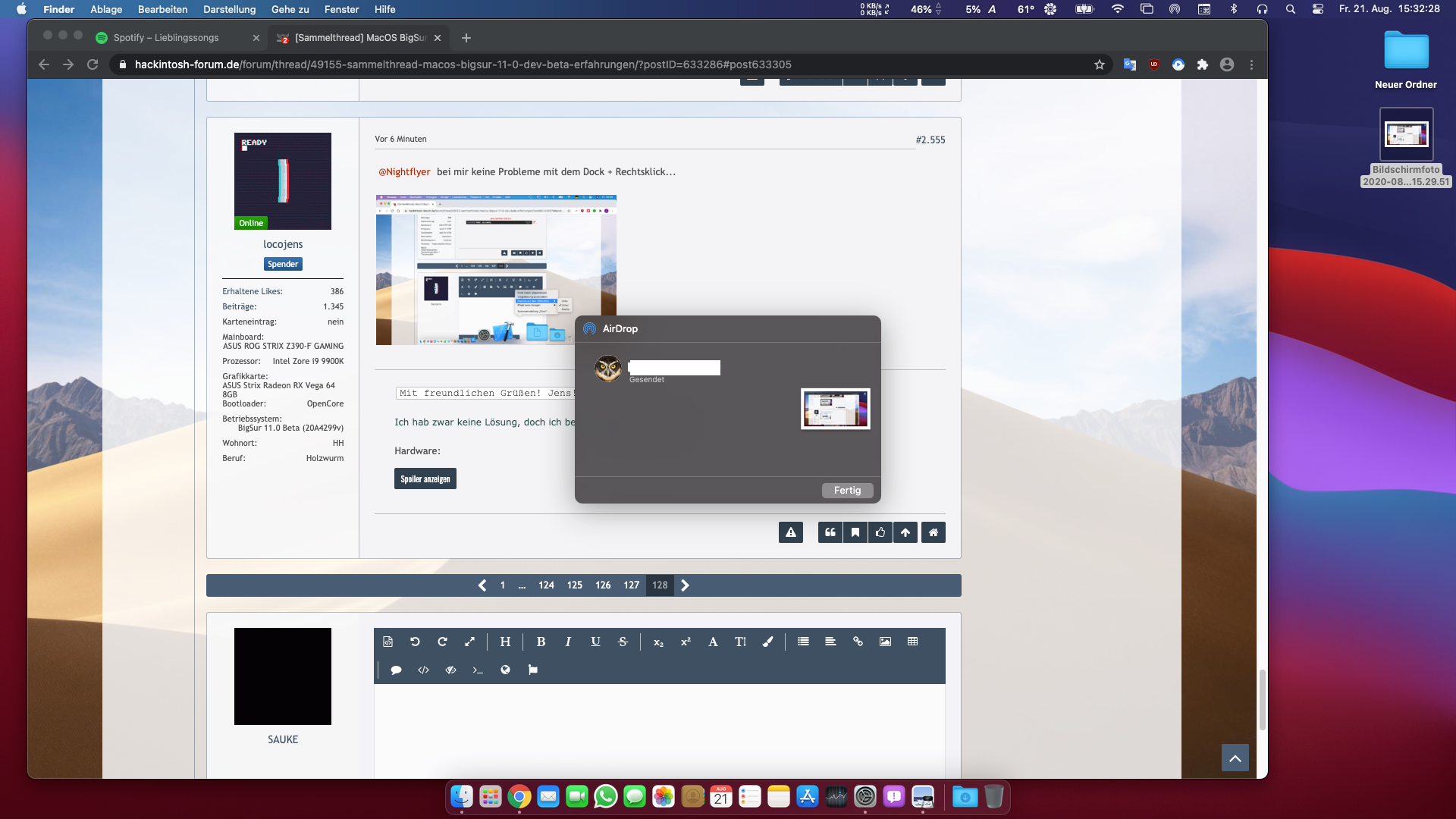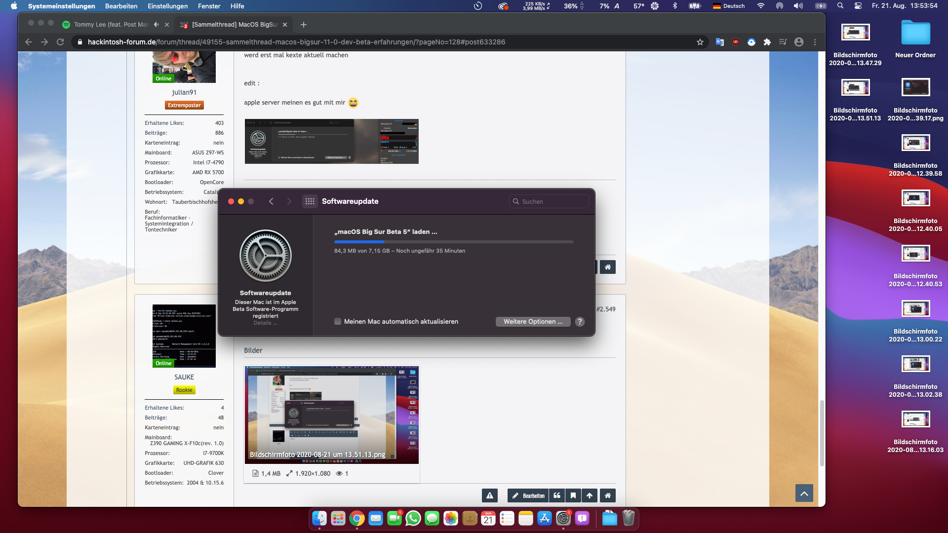 locojens, grade ist mir noch aufgefallen das AirDrop auch richtige Probleme hat und werde einen USB-C USB Stick kaufen und darauf (Catalina) Installieren damit ich es testen kann ob das an der (Beta) liegt und meine (Bluetooth Maus von Logitech G403) hat auch unter (Big Sur Beta) voll die Probleme und danke für den Tip.