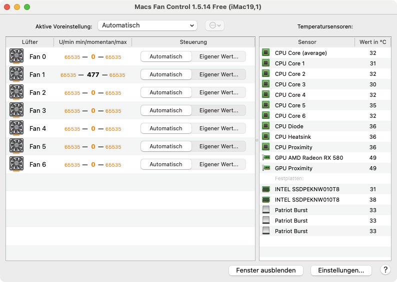 Ich hatte vorher auf derselben Hardware Catalina mit Clover laufen. Dabei war der Lüfter nur während des Bootvorgangs zu hören, danach war der Rechner praktisch lautlos. Jetzt läuft der Lüfter aber mit derselben Lautstärke wie beim Booten weiter.