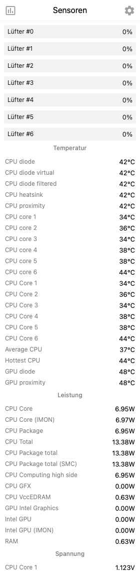 mhauser hat im allerletzten Satz von Post #28 geschrieben: "Vielleicht Power Management, lass dir jeweils unter OC und Clover mal CPU-Temperatur und -Takt plotten". Mehr Feedback habe ich dazu noch nicht erhalten. Ich habe mir mal Macs Fan Control runtergeladen und ich sehe das: