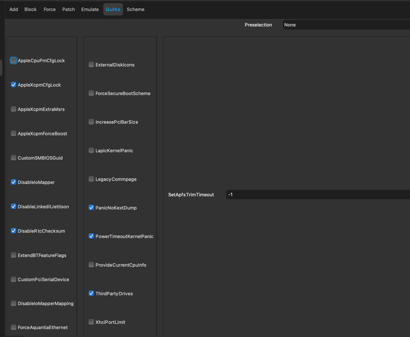 okay, und was muss ich dann in der Sektion Kernel/Quirks eintragen? Weiter -1 oder 0? oder gar nichts?