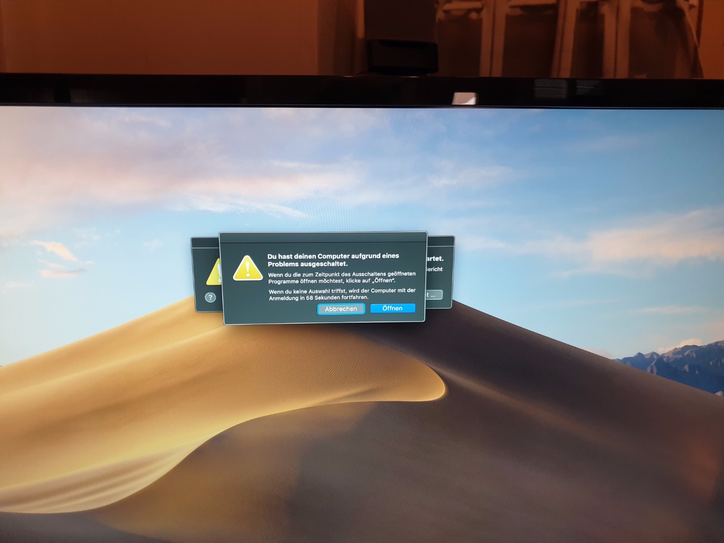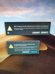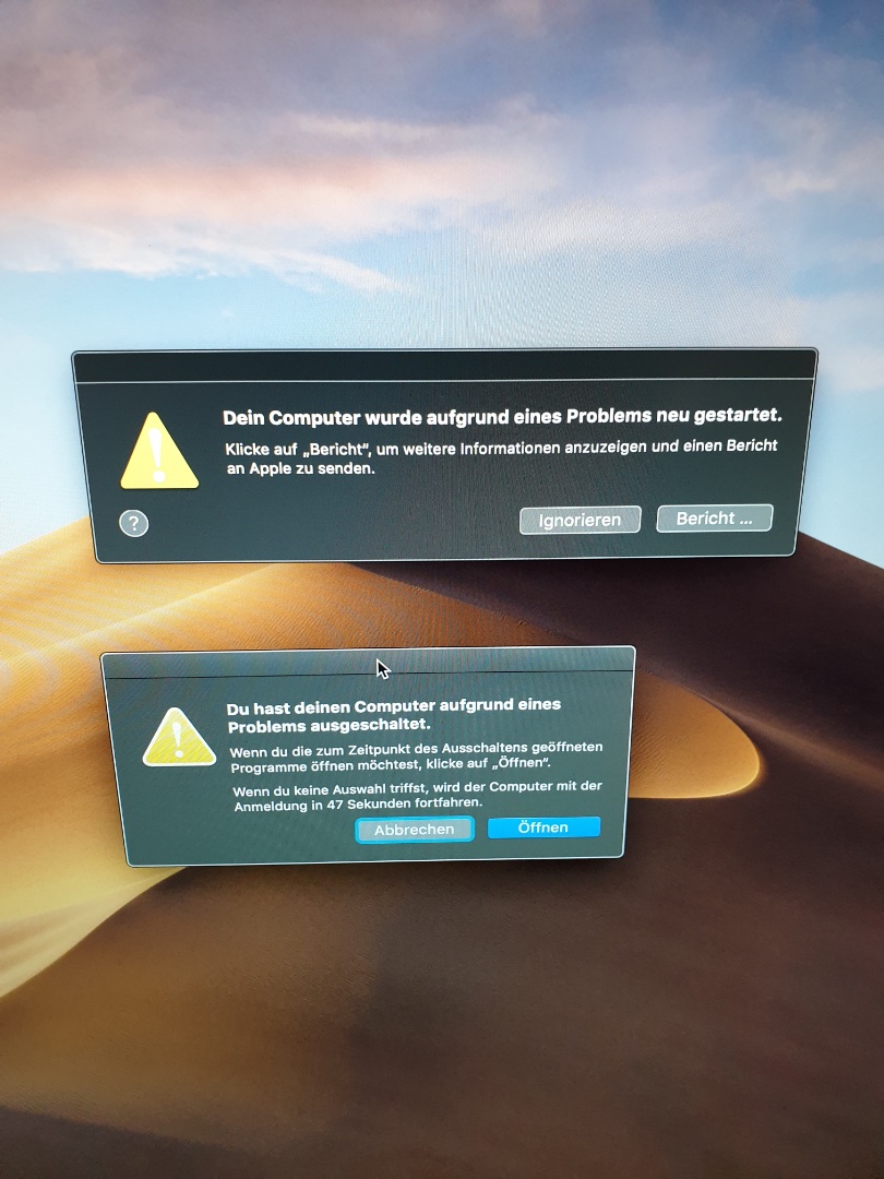 Ich werde jetzt mal neustarten, weil danach ja immer die Fehlermeldungen kamen (beim Start und nachdem Mojave geladen war)