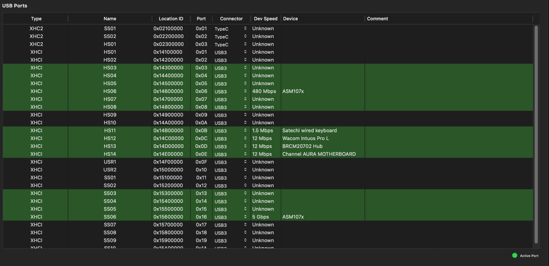 Also USB läuft jetzt, aber TB3 immer noch Fehlanzeige. Wird unter IOReg zwar angezeigt, RP05 ist in der ssdt entsprechend hinterlegt. Aber angeschlossene Wechselplatte läuft nicht. Wie war das noch unter USB Hackintool? Werdne die TB3 Anschlüsse vom Board dort auch angezeigt? Sind das die SS01/02 oder USR1+2?