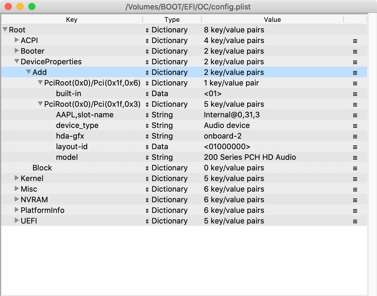 Im Hackintool kannst du im Bereich PCI alle DeviceProperties exportieren lassen. Ich übernehme dann Sachen aus der exportierten Liste wie Sound Karte (brauch die layout-id). Ich nehme nur die Sachen die oob nicht laufen.