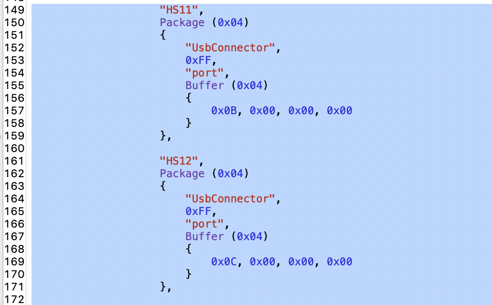 Mein erster Versuch war tatsächlich mit einem TextEditor (Bordmittel) und habe damit die SSDT-UIAC-DESIGNARE-Z390-V7.aml dahingehend bearbeitet, so dass kein HS11 und HS12 mehr in der Datei vorhanden war. Gespeichert, herunter gefahren, clover+F11, hoch gefahren bis keine Reaktion mehr.