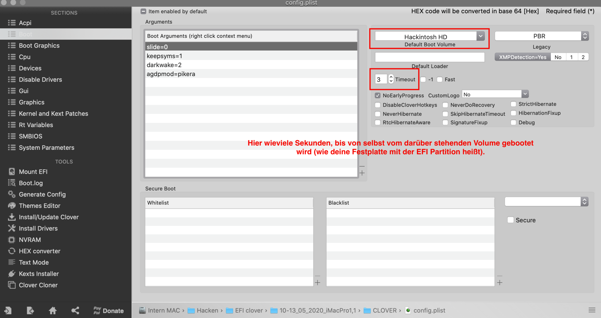Das solltest du speichern in deiner config.plist, die im Ordner CLOVER ist, der in deinem Ordner EFI liegt, der auf deiner Partition EFI liegt.