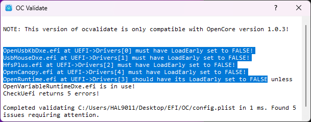 apfel-baum & cobanramo: Ich habe eben meinen Backup-Stick spaßeshalber mal in OCAT geladen und sage und schreibe 48 Fehler gefunden! Wie kann das sein? Das ist die selbe EFI-Config mit der ich bisher alles geladen habe und die auf meiner Partition lag. Sehr merkwürdig, aber erklärt warum da nichts geht.Alten EFI-Ordner habe ich auf Windows per OCAT geupdated; Eintrag unter OpenUsbKbDxe.efi auf "false" geändert.