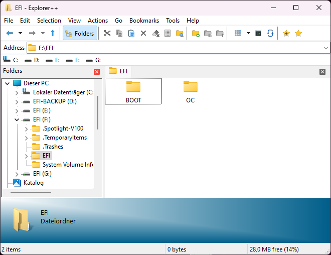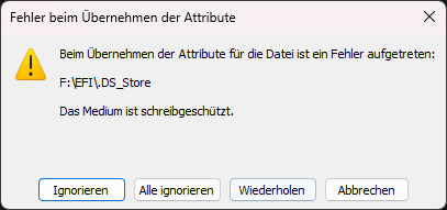 Ich kriege den geupdateten Ordner nicht auf meine EFI-Partition kopiert, wegen dem Schreibschutz. Nach längerem probieren, habe ich keinen Weg gefunden diesen über den Windows Datei-Manager aufzuheben. Falls jemand da einen Tipp hat, gerne her damit. Ein Blick in diese Partition hat jedoch offenbart, daß sich sehr wohl die angeblich fehlende OpenUsbKbDxe.efi unter Drivers aufhält. Also entweder habe ich die falsche Partition in der Mache (was nicht sein kann, da es nur eine mit BOOT und OC gibt) oder irgendwas anderes stimmt nicht.Mein Backup-Stick ist geupdated und ein Versuch mein MacOS über diesen zu booten, resultierte darin, daß ich wieder zurück auf dem Motherboardscreen landete. Mich beschleicht die Vermutung, daß mein BigSur auch einen Hau weg hat.