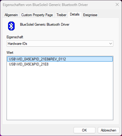 Das hat funktioniert. Mit der angegebenen Methode habe ich folgende IDs gefunden:USB\VID_0A5C&PID_21E8&REV_0112