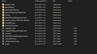 alles löschen an kexten bis auf intelMausiEthernet.kext und noch FakeSMC/VirtualSMC.kext installieren. Richtig?
