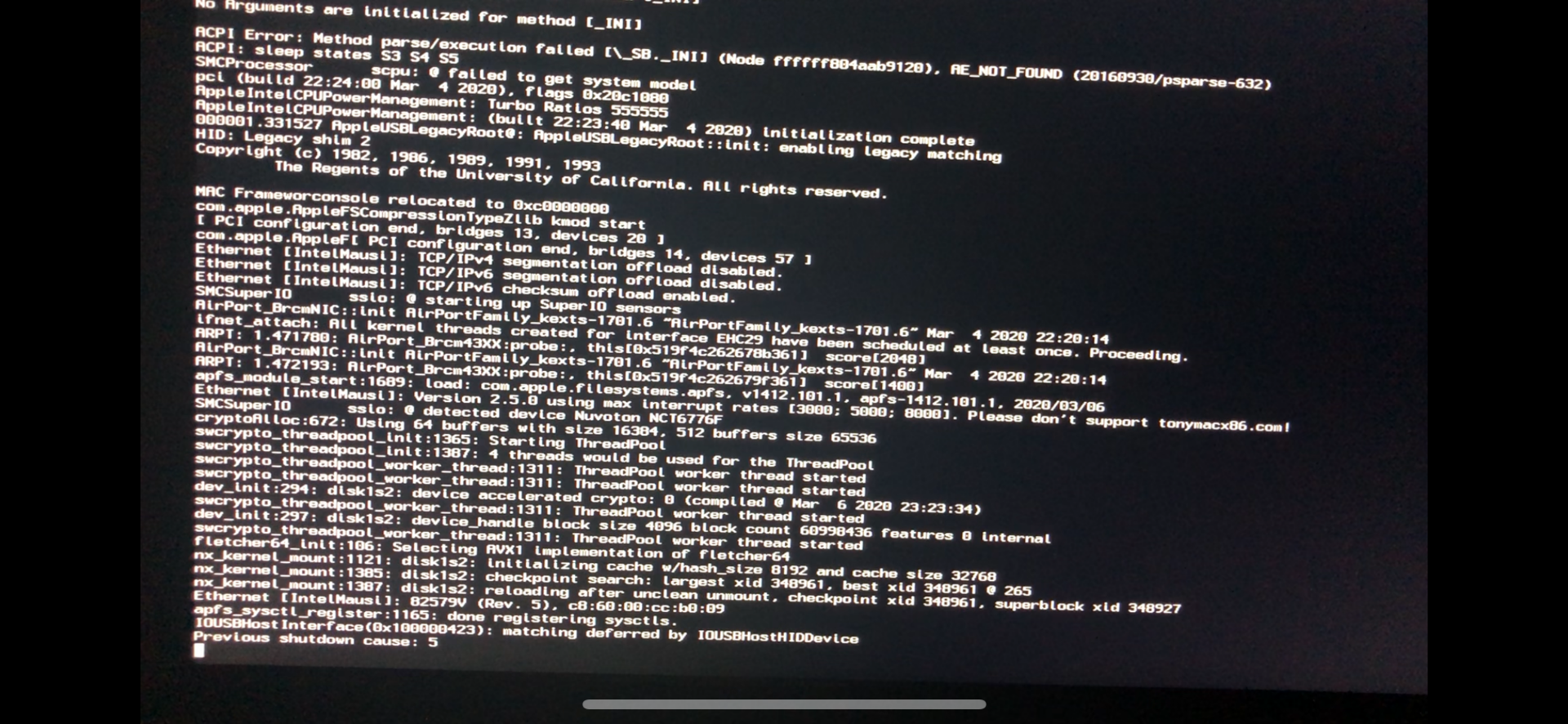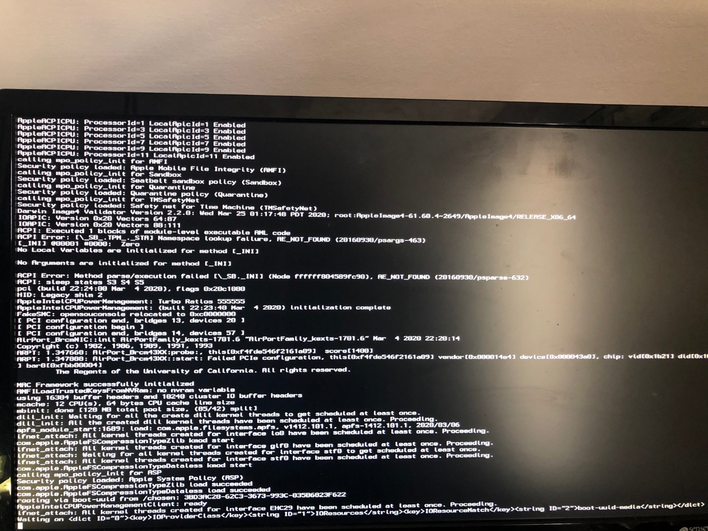 Also rebooted und dieses Mal komischerweise kein Error und dafür wieder das komplette durchlaufen von Verbose und dann der Blackscreen.
