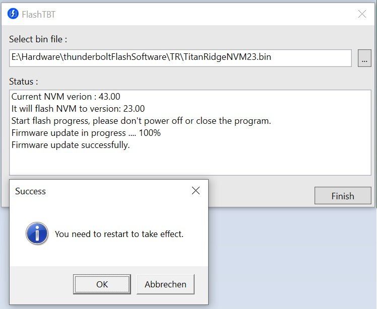 Nun hatte ich letztens mal das Thunderbolt FW Update Tool von der Gigabyte Seite ( https://www.gigabyte.com/Mothe…upport#support-dl-utility ) ausgeführt, um anschließend festzustellen, dass der Warmboot-Trick jetzt leider nicht mehr funktioniert. L Es hatte die NVM-Firmware von 23 auf 43 geupdatet. Wie zu erwarten kommt bei Gigabyte-Support anfrage nur folgende Antwort: “Verifiziertes Team hat geantwortet, es gibt keine alte Version des FW-Tools, das dem Benutzer zur Verfügung gestellt werden kann.”