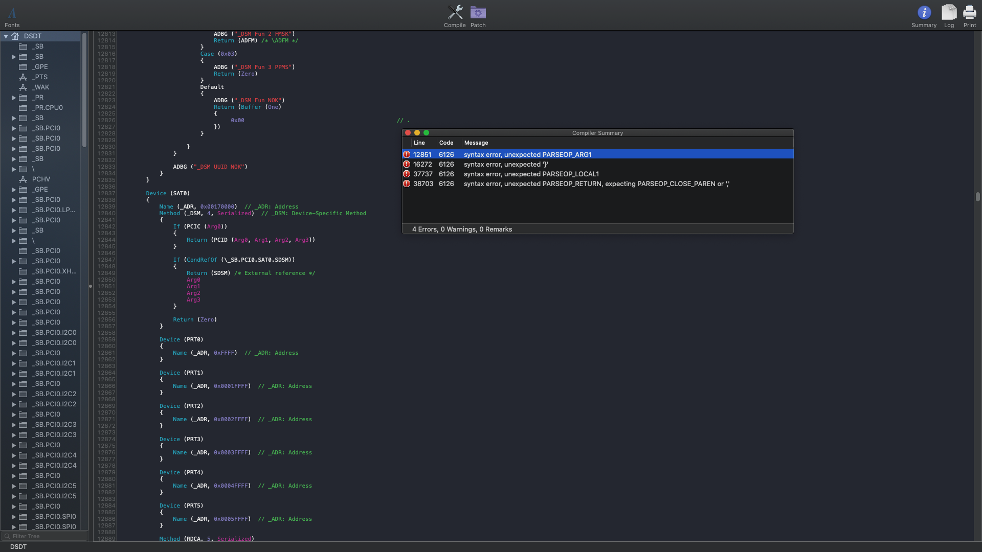 Wenn ich nach einem Neustart das Programm MaciASL öffne, dann öffnet sich die System DSDT. Dort ist aber leider immer die alte, mit den Fehlern, zu finden.