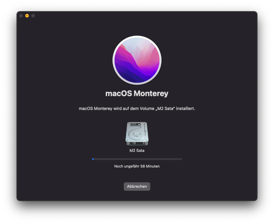 Bis einschließlich der OpenCore Version 0.7.2 konnte ich das Update auf Monterey nur herunterladen und starten (siehe Update.png). Nach dem ersten Neustart und Auswahl von Macintosh HD konnte die Installation jedoch nicht weitergeführt werden und führte wieder zurück zu Big Sur.