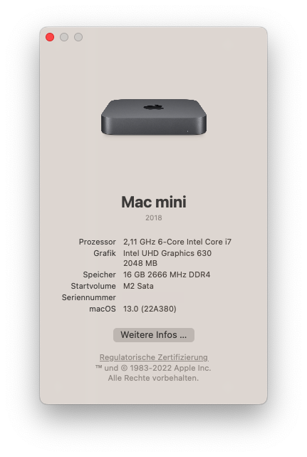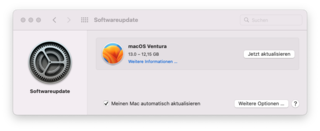 Basierend auf meinem bisherigen Beiträgen OPTIPLEX 3060 MFF - BIGSUR - OPENCORE und OPTIPLEX 3060 MFF - MONTEREY - OPENCORE konnte ich mit der aktualisierten Open Core Version (0.8.5) das Update auf Ventura erfolgreich durchführen. Das Update wurde mir sogar (im Vergleich zu den Monterey Versionsupdates) angeboten (siehe Update_verfügbar.png).