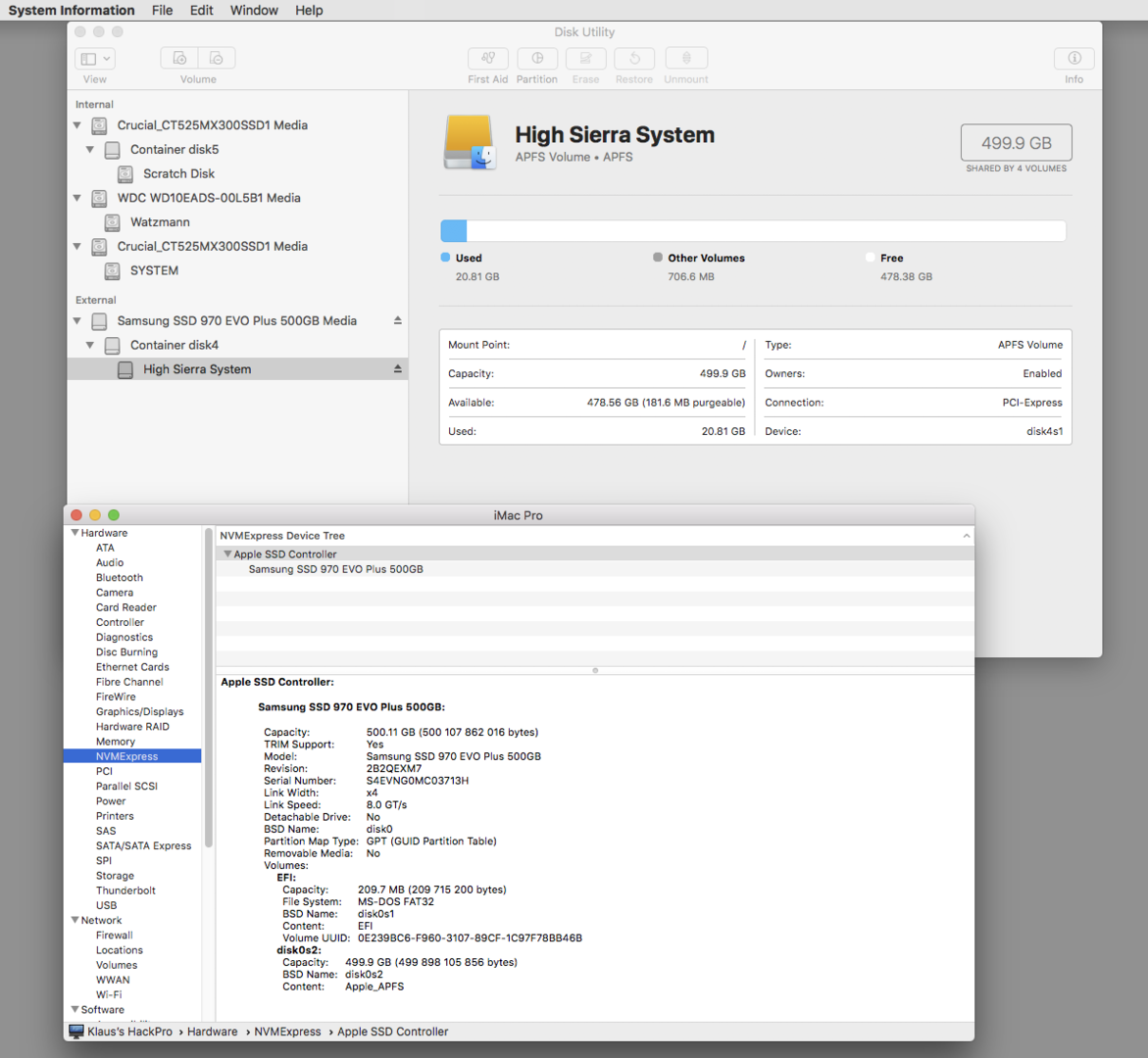 - Die funktionierende Sierra Installation habe ich auf eine zweite SSD gecloned inklusive der EFI Partition mit allem was dazu gehört.