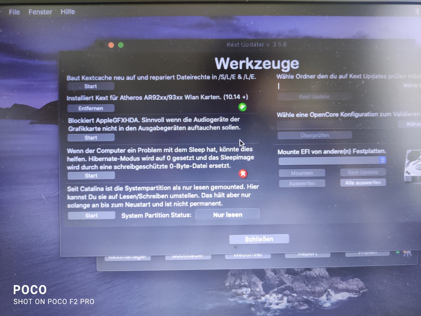 Habe vorab alles was ich davor unternommen habe bezüglich WiFi runtergeschmissen. Den alten Kext aus Mojave gelöscht aus System Library Extentions. Und dann mit Kext Utility den Cache neu aufgabaut.