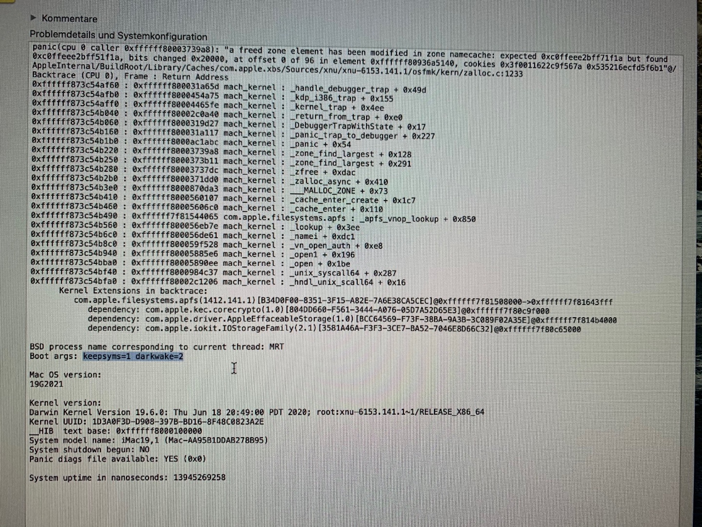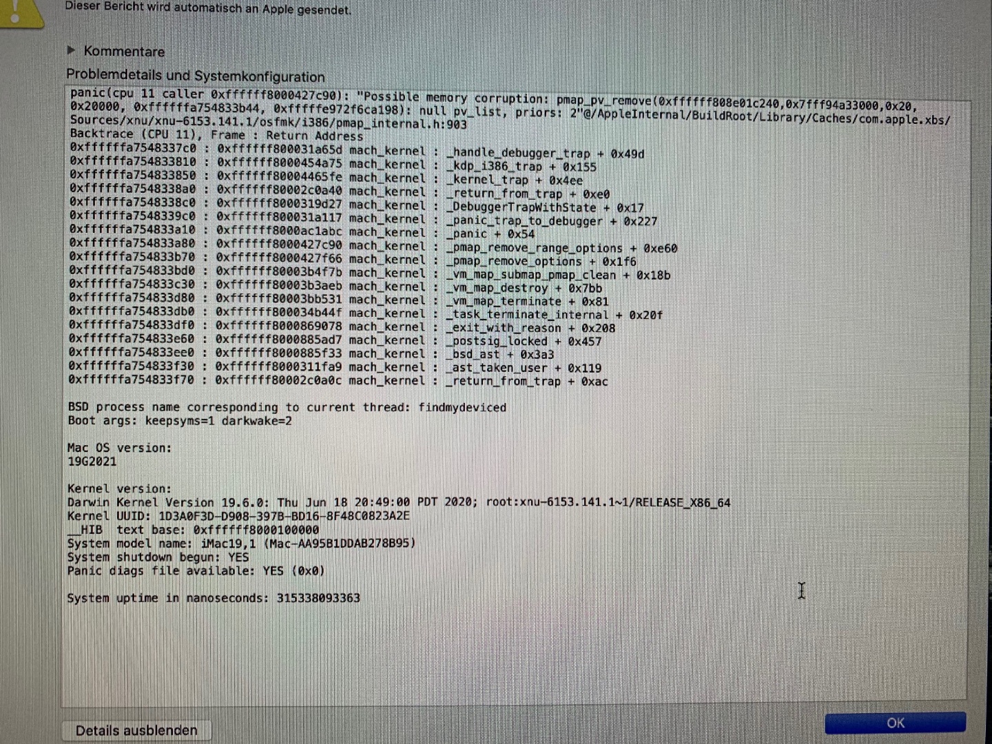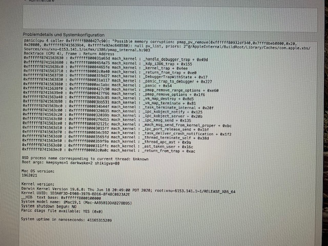 Nach einem missglückten Ausflug nach Clover/Mojave habe ich mich Dank deiner Hilfe an die OC Catalina Neuinstallation gewagt. Diese lief super, allerdings fährt das System bei unterschiedlichen Tätigkeiten runter, was bedeutet, ich bekomme den Anmeldebildschirm, dann die Applefehlermeldung, das System fährt ganz runter, dann kommt der.Apfel, um danach wieder komplett neu zu booten. Kann es nur unterbrechen durch Kaltstart. Wenn ich dann erneut hochfahre wirft mir Apple diesen Fehlerbericht aus:.