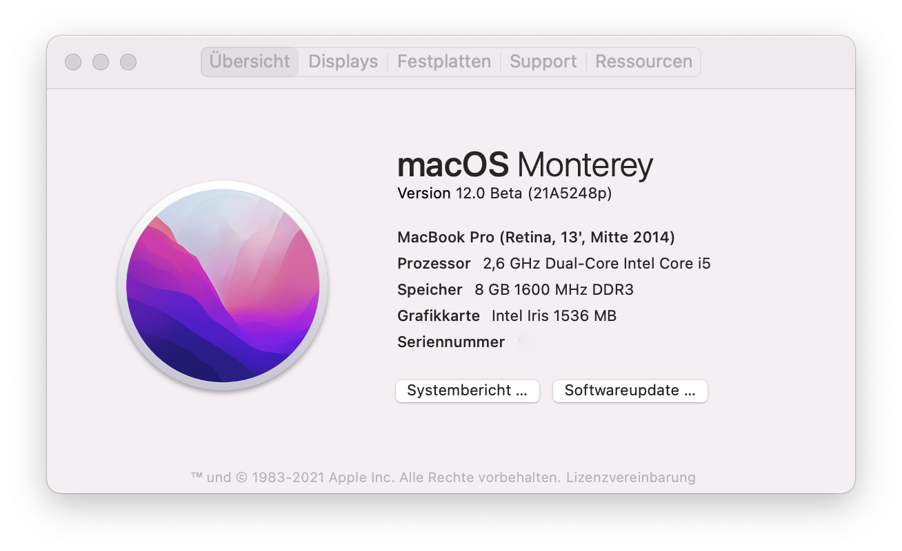 Auf dem MBP 13" (Mid 2014) lief das Update ebenfalls ohne Probleme durch. Hier musste ich, wegen der fehlenden offiziellen Unterstützung, den OpenCore Legacy Patcher installieren. Hierbei musste ich auf die Nightly zurückgreifen. Auch hier lief die Installation ohne Probleme. Hardware scheint komplett kompatibel zu sein.