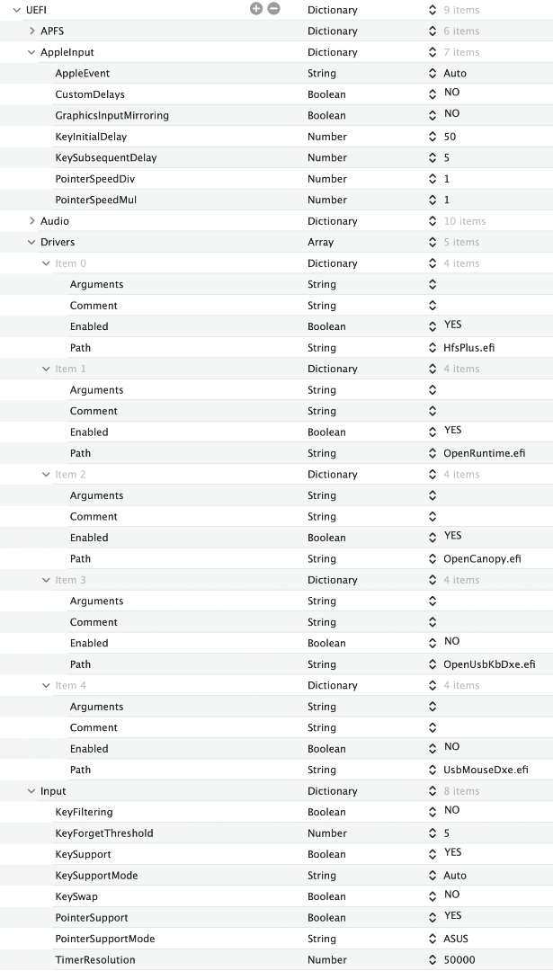 Nun bin ich seit Stunden dabei, die Maus im externen Boot-Picker ans Laufen zu bringen. Weder mit Tastatur noch Maus lässt sich er Picker verwenden (interner oder externer Picker). Die Einstellungen im BIOS und der config.plist bin ich mehrfach durchgegangen und finde keinen Fehler. Ich weiß, dass ich in der alten Installation auch ein bisschen fummeln musste, aber am Ende hat es dann funktioniert. Hat jemand einen Tipp, wo ich einen Parameter falsch gesetzt haben?