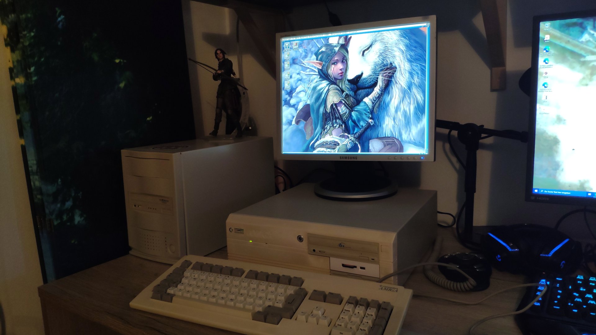 Der Amiga 4000 mit 68060. Wobei hier die Phase 5 Cyberstrom MK II @50 zum Einsatz kommt. ZZ9000 ( Das ist eine Neuentwicklung), SCSI Controller über die MK II. Als Soundkarte die Perlude ZII mit dem Decoder Modul. CD. SD Karte mit 32 GB. Der Amiga 4000 hängt dann noch an einen SCSi Tower. In dem befindet sich noch mal eine CD Brenner. ( Sind in meinen Amiga alles CD Brenner ), eine SD als Festplatte mit 32 GB und noch einen original SCSI Festplatte mit 2GB.