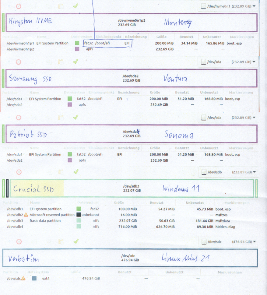 Ah, im OCAT im OpenCore Feld bei "choose Open Core Version" auf "Latest Version" gehen und dann "Get OpenCore" und dann auf "Start Sync" dann sehe ich 0.8.5. Das habe ich verstanden. Ich habe die EFI auf der MacOS SSD ausgetauscht, die funktionierende umbenannt. Neustart und kein Starten mehr, nur diese Hinweise auf dem Bildschirm. Habe mit Linux versucht auf die EFI zuzugreifen, aber es wird nicht gemountet. Weiß jemand wie ich auf die MacOS SSD auf die EFI zugreifen kann? (außer ein MacOS PC). Dann könnte ich die vorherige EFI wieder umbenennen. MfG McDaniel