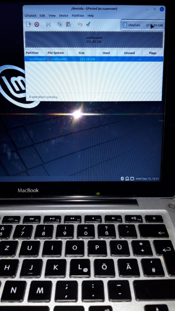 Wenn ich Gparted starte zeige es mir eine völlig lehre Platte an ohne Partitionen der Installer auch.