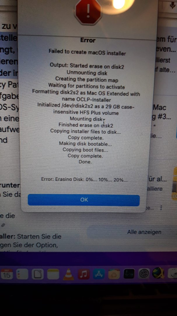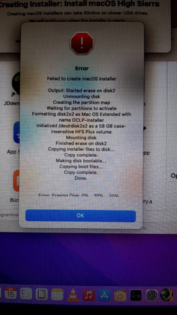 Das erstellen des Bootstick für die High Sierra Installation mittels OCLP hat mit einer Fehelermeldung abgebrochen aber er bootet trozdem nur der Installer möchte nicht auf dem Macbook installieren.