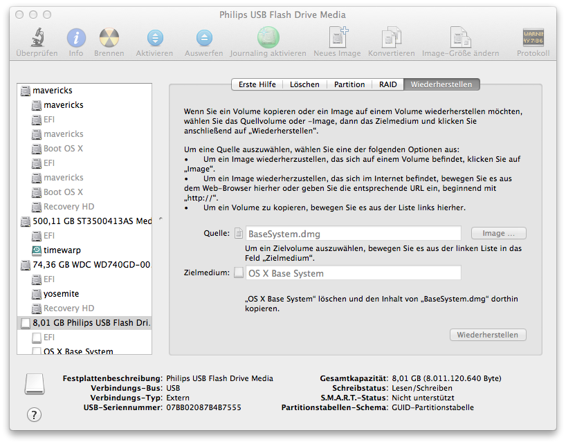 - OS X Install ESD öffnen -> BaseSystem.dmg in das Festplattendienstprogramm auf Quelle ziehen