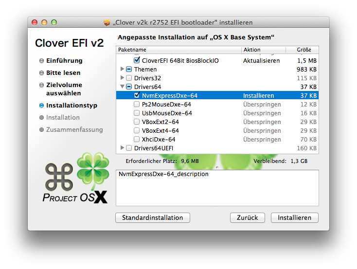 Aktuell ist abgesehen von Ozmosis noch immer Clover der einzige Bootloader der Yosemite sauber booten kann von daher liegt der Schluss nahe, dass wir für unser Thinkpad ebenfalls Clover als Bootloader benutzen. Keine Sorge Clover sieht auf den ersten Blick zwar kompliziert aus ist aber auch nicht komplizierter von der Handhabung als zum Beispiel Chameleon oder Chimera. Machen wir uns also ans Werk und sorgen dafür, dass unser USB Stick bootfähig wird hierzu öffnen wir das Installationspaket von Clover und wählen folgende Optionen aus: