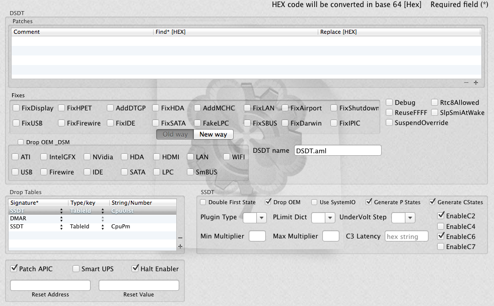 Jetzt geht es an das eigentliche einstellen von Clover und hierbei arbeiten wir uns von Rubrik zu Rubrik weiter wobei wir mit ACPI anfangen. Da wir schon eine für unsere Zwecke passend gepachte DSTD einsetzen müssen wir zunächst alle on the Fly DSDT Patches von Clover deaktivieren. Zu diesem Zweck werden ALLE Haken im Bereich Fixes entfernt (achtet Bitte darauf, das Dieser Bereich zwei ebenen besitzt und Ihr wirklich in beiden Ebenen alle Haken entfernt. Die Ebenen lassen sich durch einen Klick auf die Schaltflächen "Old way" "New way" umschalten). Sind alle Haken entfernt kümmern wir uns um das Powermanagement hierzu setzen wir im Block SSDT je einen Haken bei "Drop OEM", "Generate P-States", "Generate C-States", "EnableC2" und "EnableC6" zudem setzen wir noch Haken in "Patch APIC" und "Halt Enabler". Ist das erledigt sind wir mit dem Block ACPI fertig und sollten folgendes Bild sehen: