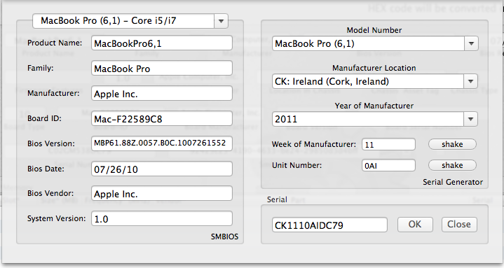 Die Rubriken GUI und Graphics brauchen wir nicht anfassen, wir machen weiter in der Rubrik Kernel and Kext Patches. Hier setzen wir unsere Haken bei Kernel CPU, Kernel LAPIC und KernelPM alle anderen Felder haken wir ab sofern sie nicht eh abgehakt sind (RTC Patch ist nicht nötig, da DSDT entsprechend angepasst). ScreenShot erspare ich mir an der Stelle und es geht weiter mit der Rubrik SMBios. Öffnet die Rubrik und klickt auf den Zauberstab. In dem dann erscheinenden Dialog wählt Ihr als System das MacBook Pro6,1 aus und klickt einige male auf beide "shake" Buttons um eine möglichst individuelle Seriennummer zu generieren.