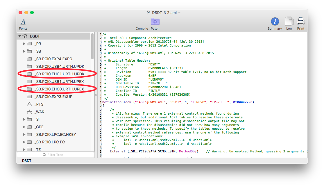 Damit der PortInjector funktionieren kann bedarf es eines kleinen DSDT Edits der sicherstellt, dass zum einen die Apple eigenen injectoren nicht anspringen und zum anderen RehabMans Injector ermöglichen die USB Ports entsprechend zu erkennen und anzusprechen. Um die DSDT bearbeiten zu können benötigt Ihr MacIASL und natürlich Eure DSDT. Einmal installiert startet Ihr MacIASL und öffnet Eure DSDT darin. Das Ergebnis sieht dann in etwa so aus: