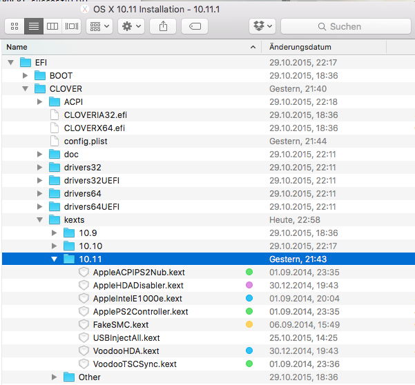 Weitere Einstellungen müssen erstmal nicht vorgenommen werden allerdings könnt Ihr nach freiem Gusto noch ein Theme auswählen wenn Ihr möchtet oder in der Sektion Drivers64 noch Haken setzen bei "NvmExpressDxe-64" oder "PS2MouseDXE-64" für die Installation als solche ist beides aber nicht erforderlich. Einmal installiert geht es nun daran Clover an die eigenen Bedürfnisse anzupassen hierzu statten wir den USB Stick nun erstmal mit allen nötigen Extensions aus, die zum booten der Installation benötigt werden. Sieht man sich auf dem erstellten Stick ein wenig um findet man auf Ihm einen Ordner namens EFI in dem sich der Unterordner Clover verbirgt und in Ihm wiederum ein Ordner namens Kexts und das ist unser Ziel. Hier bringen wir alle nötigen Extensions unter zur Installation von ElCapitan. Bei mir sieht das so aus (Wichtig, bitte auch in 10.10 und Others ablegen da Clover hier manchmal ziemlich zickig ist beim erkennen der richtigen Version) :