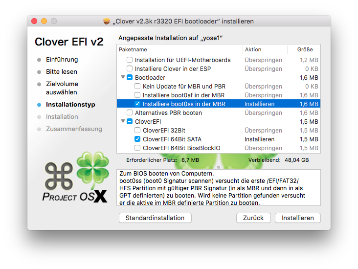 Wie der Stick selbst mittels Diskmaker oder CreateInstallMedia erstellt wird führe ich hier nicht weiter aus, denn dazu gibt es zahlreiche Anleitungen im Forum und die Vorgehensweise ist immer dieselbe daher werde ich mich darauf konzentrieren zu beschreiben wie der Stick startfähig gemacht wird und wie die nötigen Extensions ihren Platz auf dem Stick finden. Ist der Stick also einmal erstellt wird zunächst Clover auf dem USB Stick installiert. Hierzu einfach das Installationspaket von Clover öffnen und den USB Stick als Ziel für die Installation festlegen. Anschließend folgende Optionen auswählen (Achtung anstelle von Clover SATA bitte BIOS BlockIO wählen):