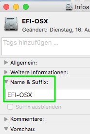 Wenn man mal mehrere EFI-Partitionen gleichzeitig mounten muss um deren Inhalte zu vergleichen, verändern oder auch nur zu prüfen, stellt man schnell fest, dass der Finder mit den mehrfachen Darstellungen es Namens "EFI" keine Hilfe beim Unterscheiden ist, auf welcher EFI man sich gerade befindet... ![]()