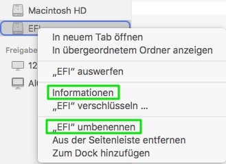 Dafür klickt im Finder mit der rechten Maus auf die jeweilige EFI-Partition und nutzt entweder die Option "'EFI' umbenennen" oder "Informationen".