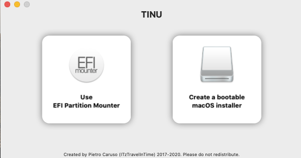 Nun gibt es die Möglichkeit den USB Stick mit dem Tool "Tinu" von ITzTravelInTime zu erstellen. Das ist ein Gui, welches auf Apples CreateInstallMedia Command basiert, es erstellt einen cleanen USB Installer, der auch auf Real-Macs verwendet werden kann. Man kann den Stick aber auch auf dem "klassischen" Weg mit dem Terminal erstellen. Welchen dieser Wege ihr wählt könnt ihr euch aussuchen, das Ergebnis wird das gleiche sein.