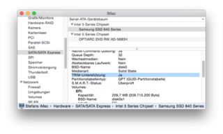 Wenn alles erledigt ist könnt ihr über das Programm „Systeminformationen“ (Menüleiste -> Über diesen Mac -> Systembericht) im Bereich SATA/SATA Express überprüfen, ob alles geklappt hat. In diesem Fall steht bei TRIM-Unterstützung: Ja