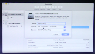 Dann wählt ihr über das Menü in der oberen Leiste "Dienstprogramme" aus und startet das Festplattendienstprogramm. Die Systemplatte auf welcher das Betriebssystem am Ende laufen soll muss formatiert werden. Wählt also die gewünschte Platte aus, geht auf Formatieren oder Löschen und wählt folgendes aus: